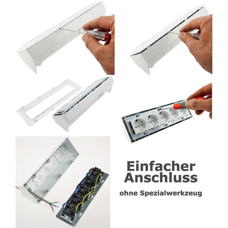 - Easy assembly suitable for vertical & horizontal mounting. Additional socket for e.g. kitchen appliances, electrical tools, a radio, a charger for the smartphone.