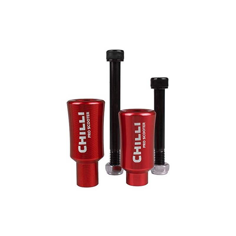 The Chilli stunt scooter pegs are available in different colours, shapes, material thicknesses and accordingly in different weights. The barrel pegs are our bestsellers, fit many stunt scooter models and with only 62 g without axles, these aluminium pegs are also beautifully light.