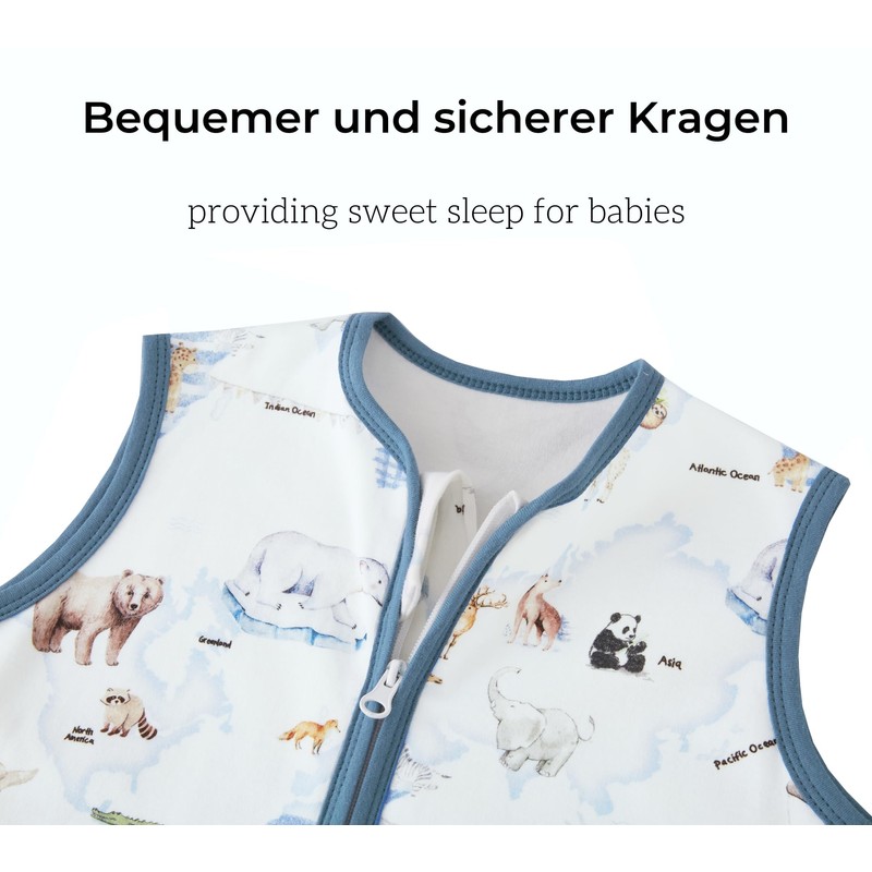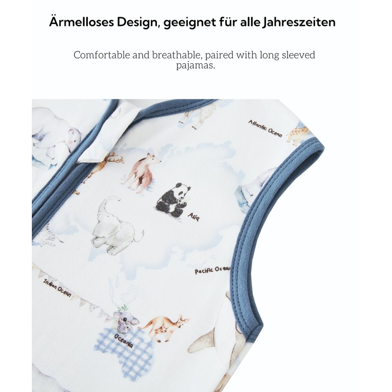 • 1.5 tog year-round sleeping bag with 2-ply 100% cotton is suitable for room temperature 21-23 degrees. Ideal for the transitional period. Sleeveless design can be combined with long or short sleeve pyjamas inside.