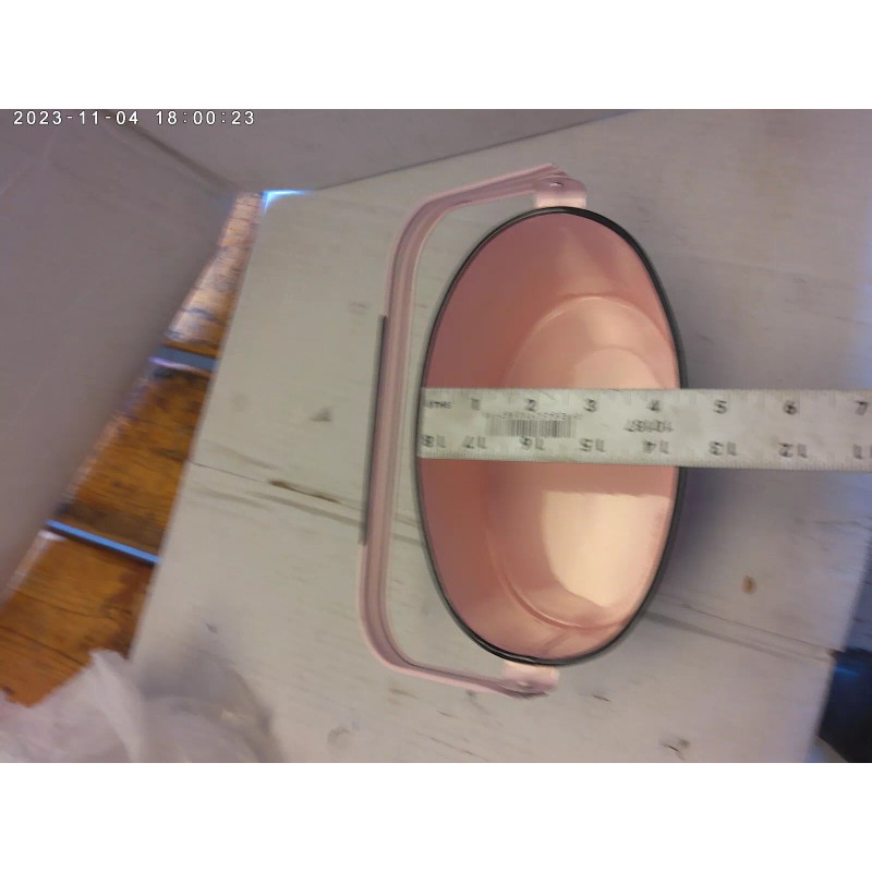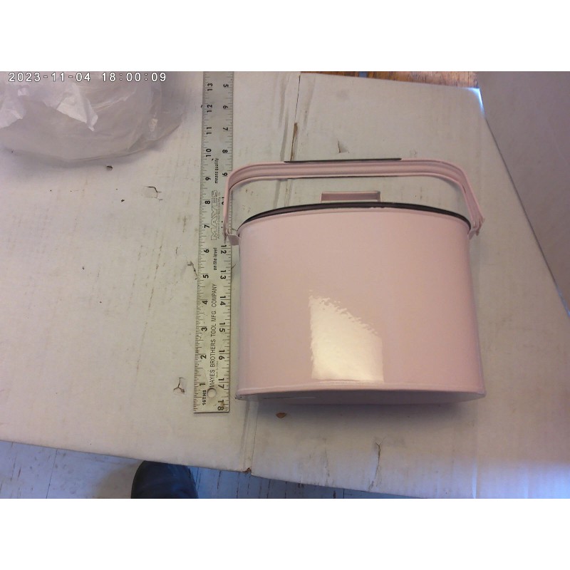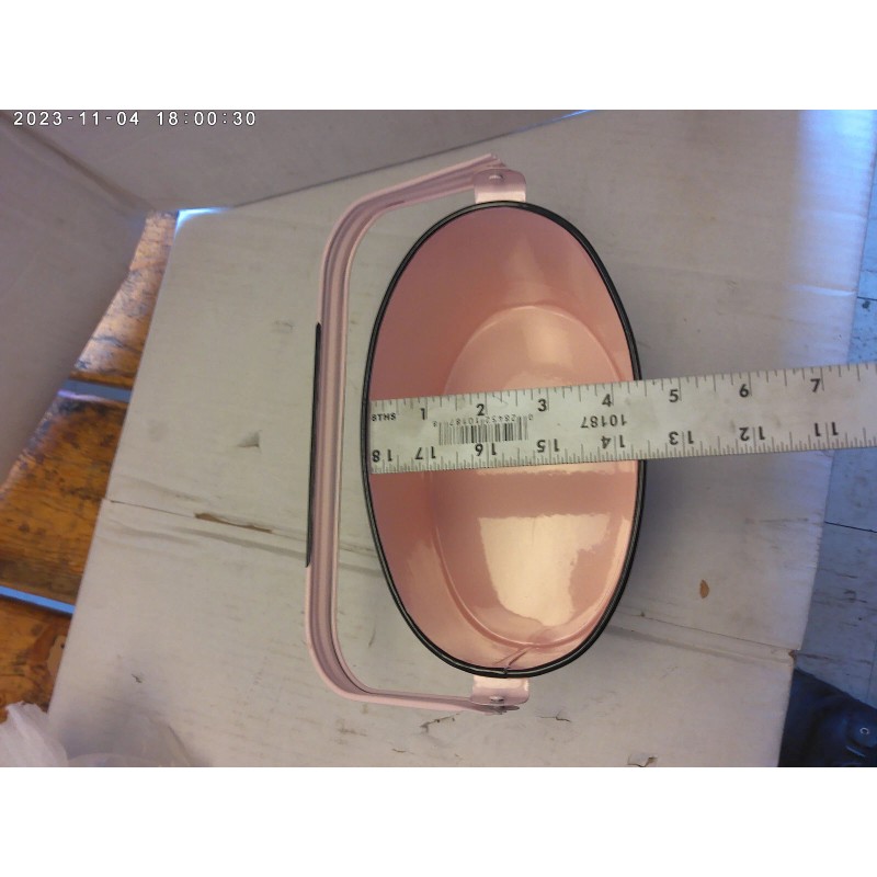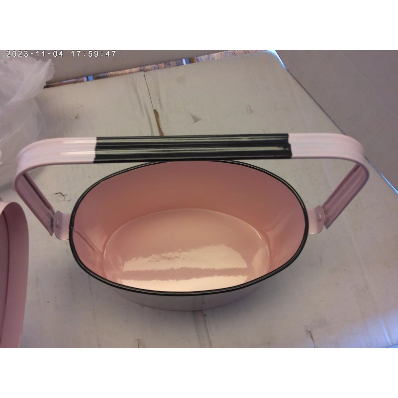 This decorative enamelware pail in a lovely pink color comes with a convenient lid and handle for easy transport. It is not flame resistant due to its material and is branded from China. The pail is perfect for use as other collectible cookware or for adding a touch of charm to any kitchen or home decor. Its unique design and functional lid make it a versatile piece for various uses around the home. Not Flame Resistant.