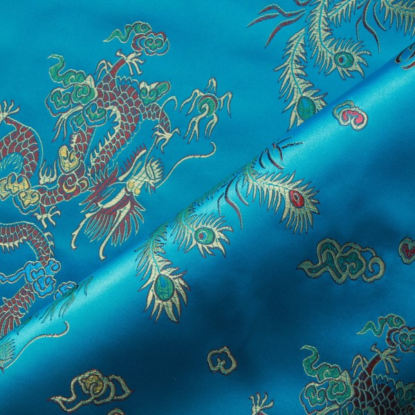 Chinese Embroidered Brocade Fabric 100% Polyester Silky Satin Dragon Floral Prints 44” Wide Various Colours Available (Dragon Turquoise)