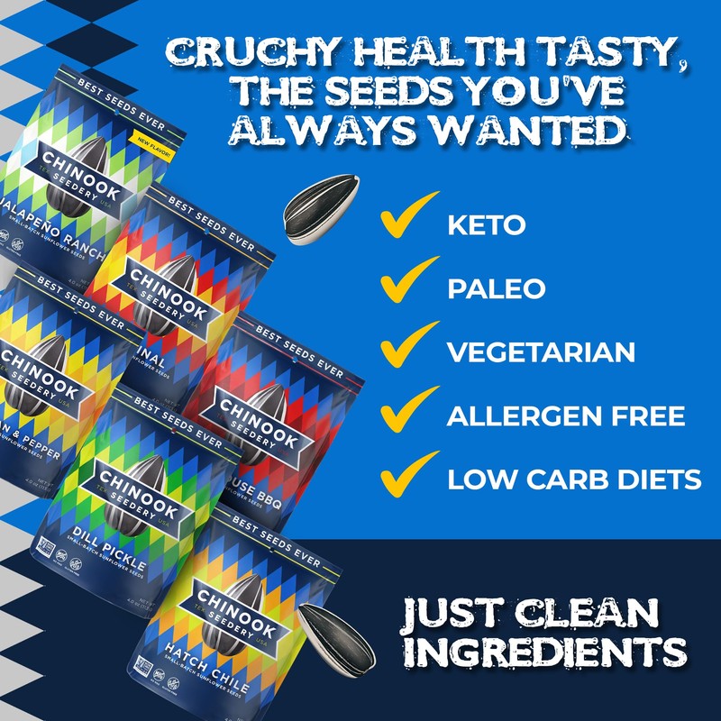 Chinook Seedery Chinook Seedery Roasted Jumbo Sunflower Seeds - Keto Snacks Sampler - Best For Snack Packs - Gluten Free, Non GMO Snack Food Gifts - 4 ounce (Pack of 6) - 6 Flavor Sampler Pack