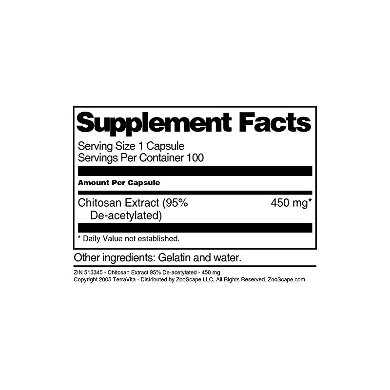 Ingredients: Gelatin, Water, Chitosan Extract (95% De-acetylated) - 450 mg