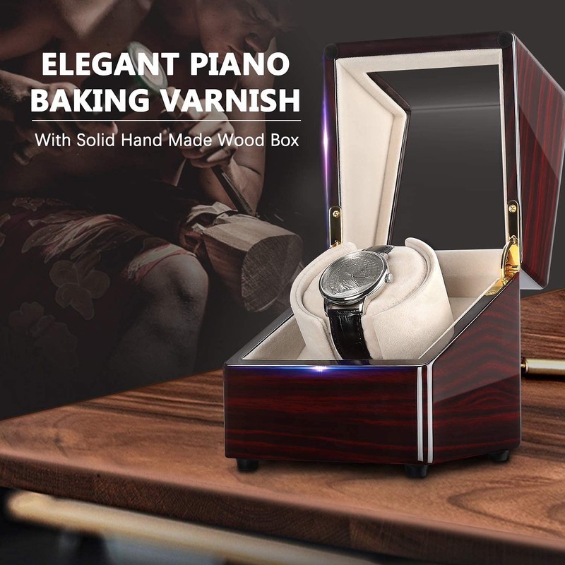 More Than Just Watch Winder, It’s Work of Art You can’t criticize the classical look of compact size case. Deluxe piano baking varnished watch winder box with brilliant finishing and luxurious design, high-quality solid wood material made. Metal Hinges are sturdy and high quality. Every watch winder experienced 21 procedures of 100% handmade work to be assembled. We took each processes in strict control and multiple inspections to present you this exquisite winder. Rotation Modes Broadly Wind Your Watch Upgrade Version have two knobs separately control direction and TPD. Combined with clockwise, counterclockwise and both direction for your choice. Fit for almost 98% automatic watch, Choose best option to avoid not enough winding and over-stressed winding. Operated by either AC Adapter(included) or 2* 1.5V Battery (not included), Simply switch on power, then the cup inside the box begin to rotation.With the battery and its impact size, you can take it to travel. No Noise, No Annoying Winding Sound With upgrades panel and the extremely quiet Mabuchi motor make sure long usage time and quieter running. This watch winder can be put on anywhere especially bedroom and office day and night. Support Both Small And Larger Watch Size The soft pillow has 80mm diameter which seats on the center of the box with proper angle is adjustable to fit for small or big watch reach to 60mm cover and straps. Don’t worry it would not hit and scratch the acrylic window. Zero Magnetization & No Harm Keep your watch accurate and secure. Anti-static treatment is done for motor & circuit board Please Pay Attention: Following different TPDs(Turn Per Day) control, short and regular stop and continue to rotate during running will happen. Not means the watch winder is broken or stopped. Can't work for Seiko kinetic watch.