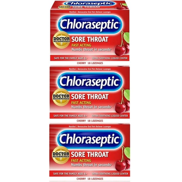 CHLORASEPTIC Lozenges STRONG! CHERRY Sore Throat & Cough 18ct ( 3 pack )
