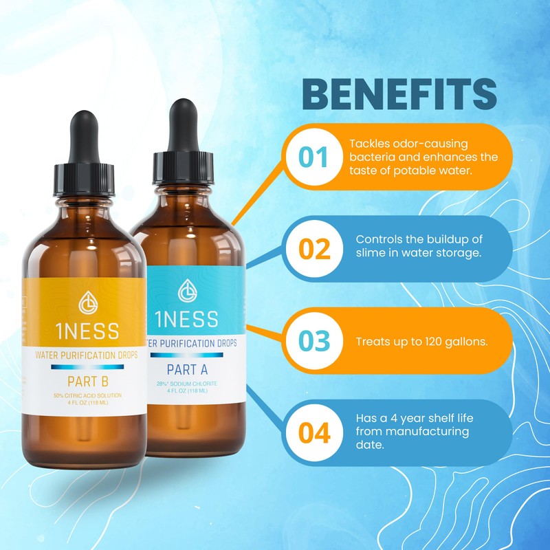 - Treat 16oz of water, simply combine 2 drops from bottle A with 2 drops from bottle B. Wait 30 seconds for the chlorine dioxide activation, then mix it into your water.