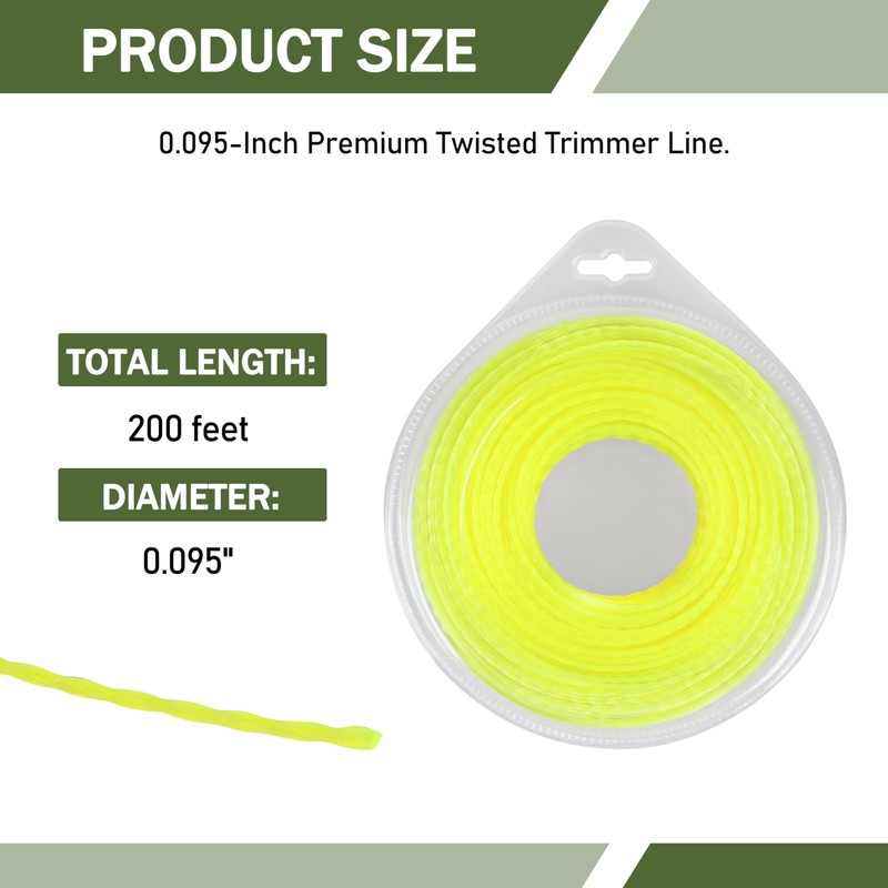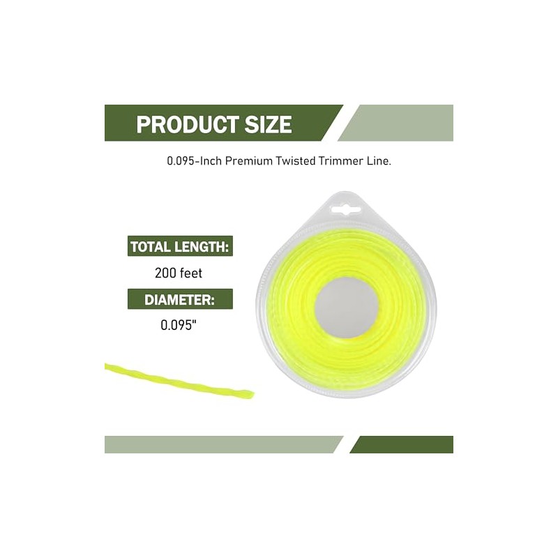 • This Twisted Trimmer Line Is 0.095'' and Line Length of the Is 200-Foot Length, Suitable for Trim Weeds, Rocks, and on the Lawn to Maintain the Cleanliness, Beauty, and Comfort of the Garden.
