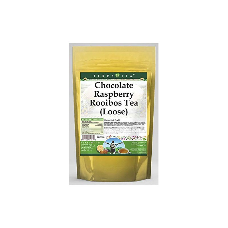 Our Chocolate Raspberry Rooibos Tea is a delightful flavored Rooibos tea with Chocolate Drops, Raspberries (Red) and Raspberry Leaf (Red) that you will really enjoy! The unique Chocolate Raspberry aroma and taste is a delight! - Ingredients: Rooibos tea, Chocolate Drops, Raspberries (Red), Raspberry Leaf (Red) and Natural Chocolate Raspberry Flavor. - Hot tea brewing method: Bring freshly drawn cold water to a rolling boil. Place 1 teaspoon of tea for each desired cup into the teapot. Pour the boiling water into the pot, cover and let steep for 2-4 minutes. Strain and pour into your cup; add milk and natural sweeteners to taste. - Iced tea brewing method: (to make 1 liter/quart): Place 5 teaspoons of tea into a teapot or heat resistant pitcher. Pour 1 1/4 cups of freshly boiled water over the tea itself. Steep for 5 minutes. Fill a serving pitcher with 1/4 cold water. Strain and pour the tea into the serving pitcher Add ice and top-up with cold water. Sweeten and garnish to taste. - TerraVita is an exclusive line of premium-quality, natural source products that use only the finest, purest and most potent ingredients found around the world. TerraVita is hallmarked by the highest possible standards of purity, potency, stability and freshness. All of our products are prepared with the highest elements of quality control, from raw materials through the entire manufacturing process, up to and including the moment that the bottles or bags are sealed for freshness and shipped out to you. Our highest possible standards are certified by independent laboratories and backed by our personal guarantee. - TerraVita exists to meet and ensure your family's health and wellness without the harmful effects or chemicals and prescription medications. We strive to make all of our products