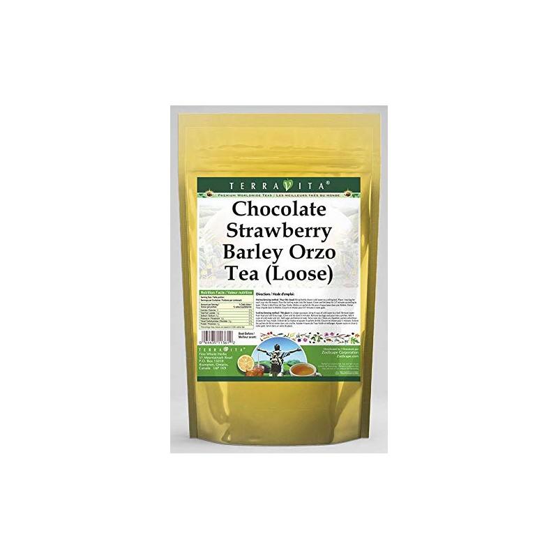 Our Chocolate Strawberry Barley Orzo tea is a tasty naturally flavored Barley Orzo roasted grain beverage (coffee substitute) with Chocolate Drops, Strawberries and Strawberry Leaf that has a refreshing natural taste that will impress you! The unique Chocolate Strawberry taste is delicious! - Ingredients: Barley Orzo, Chocolate Drops, Strawberries, Strawberry Leaf and Natural Chocolate Strawberry Flavor. - Hot tea brewing method: Bring freshly drawn cold water to a rolling boil. Place 1 teaspoon of tea for each desired cup into the teapot. Pour the boiling water into the pot, cover and let steep for 2-4 minutes. Strain and pour into your cup; add milk and natural sweeteners to taste. - Iced tea brewing method: (to make 1 liter/quart): Place 5 teaspoons of tea into a teapot or heat resistant pitcher. Pour 1 1/4 cups of freshly boiled water over the tea itself. Steep for 5 minutes. Fill a serving pitcher with 1/4 cold water. Strain and pour the tea into the serving pitcher Add ice and top up with cold water. Sweeten and garnish to taste. - TerraVita is an exclusive line of premium-quality, natural source products that use only the finest, purest and most potent ingredients found around the world. TerraVita is hallmarked by the highest possible standards of purity, potency, stability and freshness. All of our products are prepared with the highest elements of quality control, from raw materials through the entire manufacturing process, up to and including the moment that the bottles or bags are sealed for freshness and shipped out to you. Our highest possible standards are certified by independent laboratories and backed by our personal guarantee. - TerraVita exists to meet and ensure your family's health and wellness without the harmful effects or chemicals and prescri
