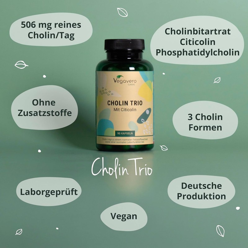 - German production: our choline high-dose capsules are manufactured exclusively in Germany to the highest quality standards. To ensure optimal quality, we test our choline not only for microbial impurities, but also for heavy metal residues and active ingredients. Of course, our product is GMO-free, free from any additives and suitable for vegans: inside.