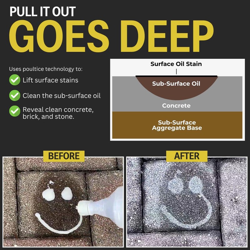 • VERSATILE FORMULA: Concrete make up varies widely and oil stains may require different cleaning techniques. Pull It Out utilizes a 'poultice' technology and is effective across the widest variety of concrete conditions and types.