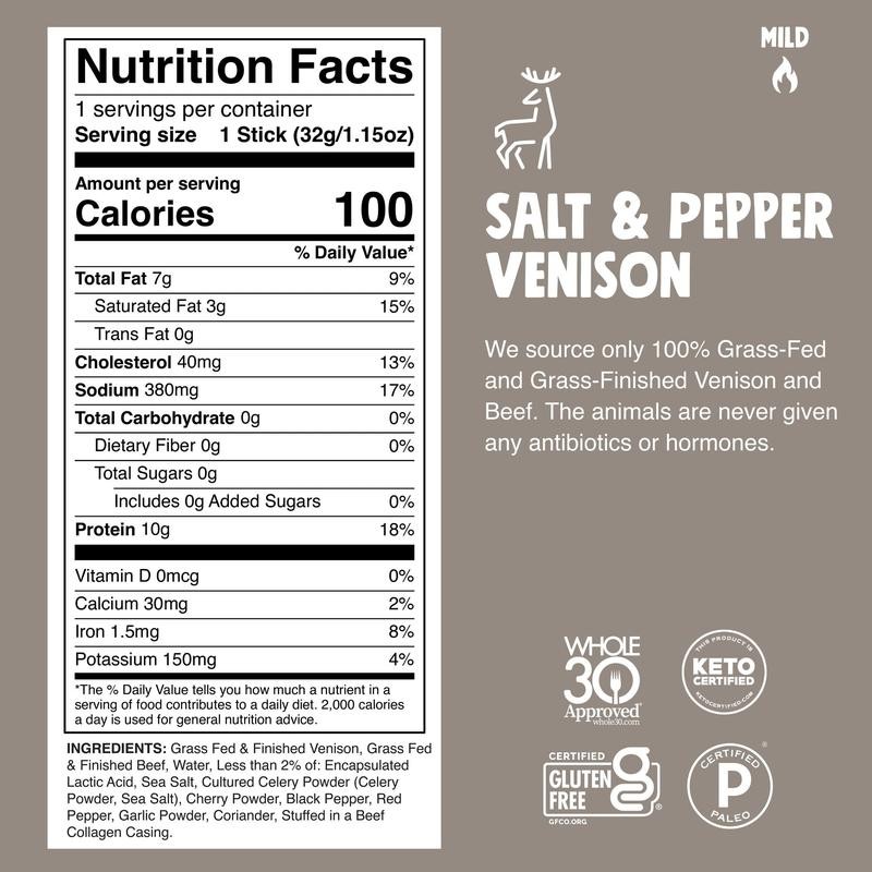 Leave the shakers at home. These venison sticks deliver table-fresh flavor with sea salt and cracked black peppercorns, for superior on-the-go snacking.