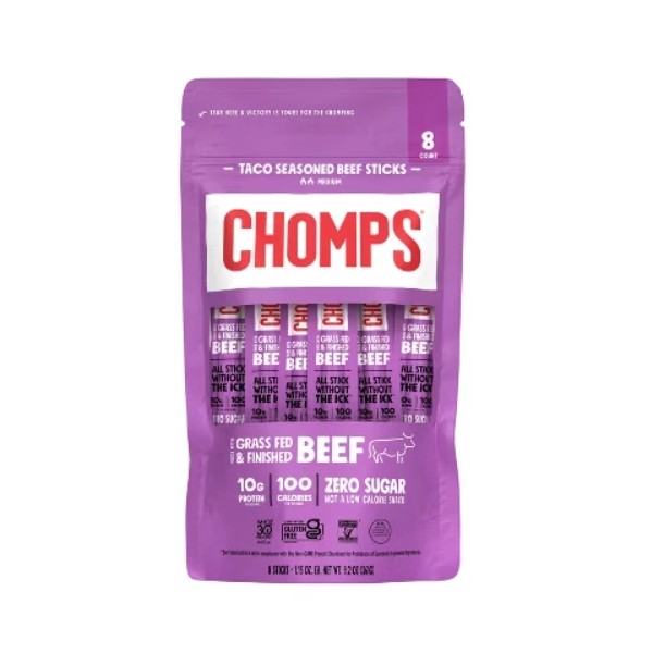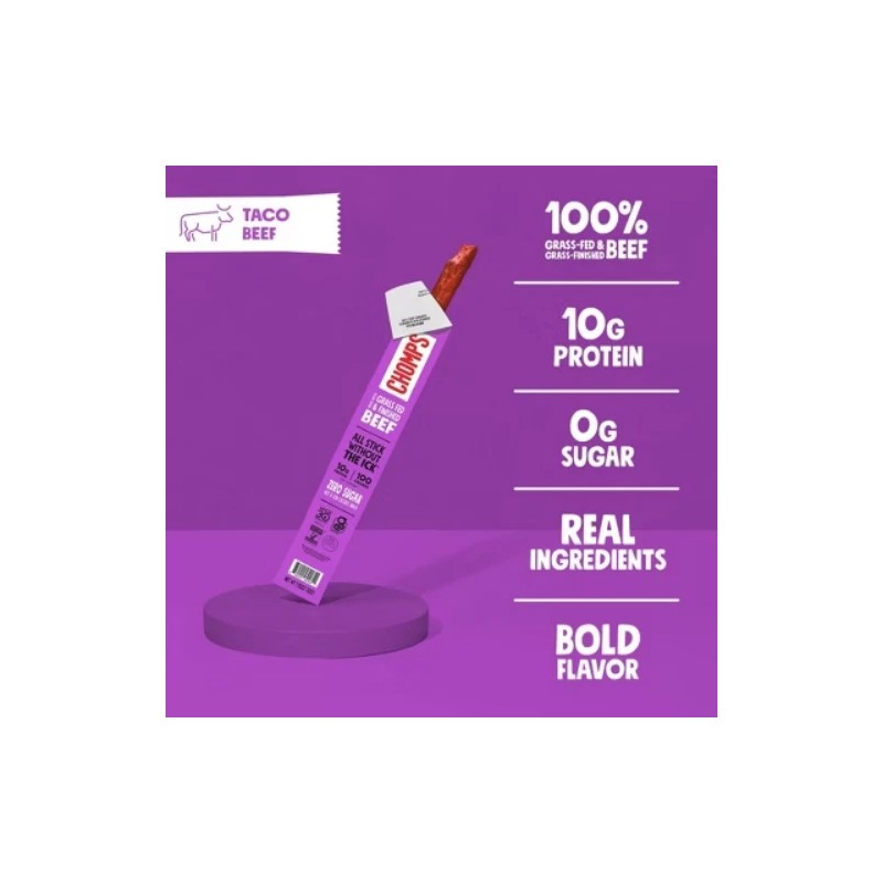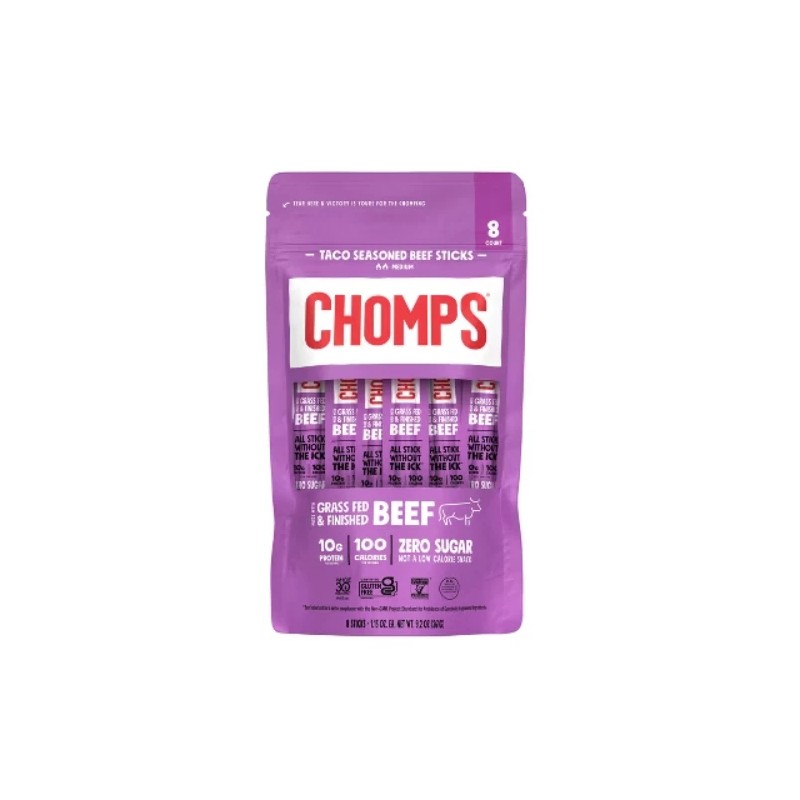 Chomps is a minority, family-owned and operated healthy meat snack brand with products made from the highest-quality proteins with no hidden, harmful ingredients. Chomps are zero sugar and never contain soy, dairy, artificial preservatives or colors, MSG, or artificial nitrates or nitrites. Additionally, Chomps is whole30 approved, certified gluten-free, and allergy-friendly. Each of Chomps Taco beef sticks are filled with 100% non-GMO verified, grass-fed and grass-finished beef, 10g of protein, and only 100 calories