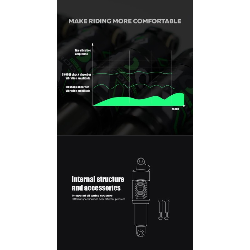 - Chooee Bicycle hydraulic rear shock absorber one-piece structure. The coil spring is used as the main body, and the hydraulic control spring is used to create shock absorption, which has better shock absorption effect and durability than ordinary spring shock absorbers.