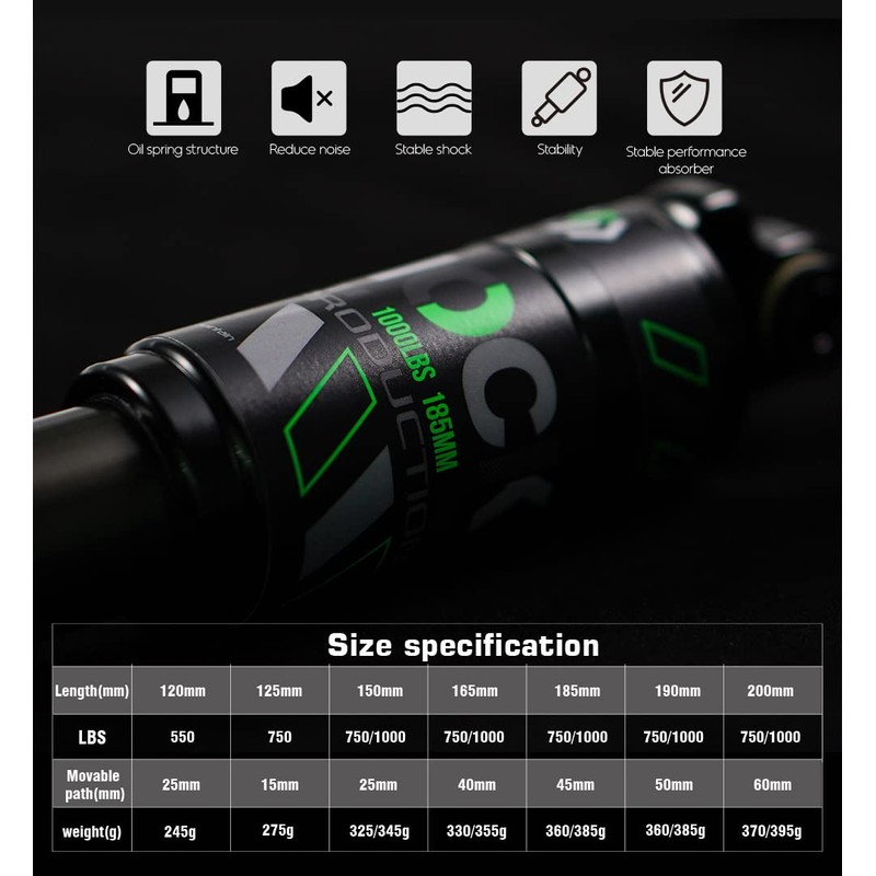 - After many repeated tests, our bicycle shock absorber has tested the most suitable weight range for riding. There are 550 pounds, 750 pounds and 1000 pounds. You can choose the pressure value that suits you superior shock absorption performance than ordinary shock absorbers and driving comfort is better.