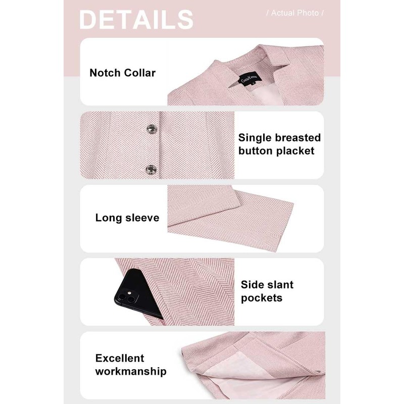 - Basic work blazer jacket is made of high quality and soft wool blend material, which is comfy and warm to wear, great for spring, fall and early winter, 4 colors: dark grey/ khaki/ light grey/ pink available.