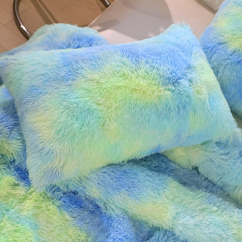 chovy Kids Girls Faux Fur Green Rainbow Comforter Sets Twin/Full - 3PC Bed Set Soft Warm Comfortable Classical Rabbit Plush Velvet Flannel Fluffy Fuzzy Bedding(Comforter x 1 Pillowcases x 2)