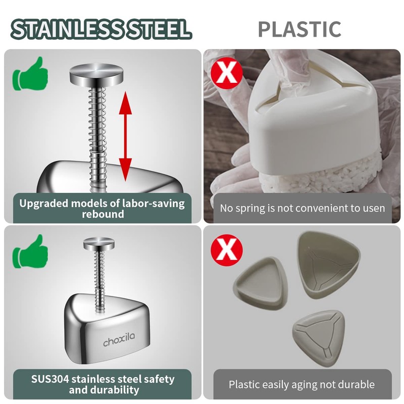 - 🍣【Premium Stainless Steel】High-quality stainless steel construction ensures durability and long-lasting performance, making it a reliable choice for making spam musubi and onigiri at home.