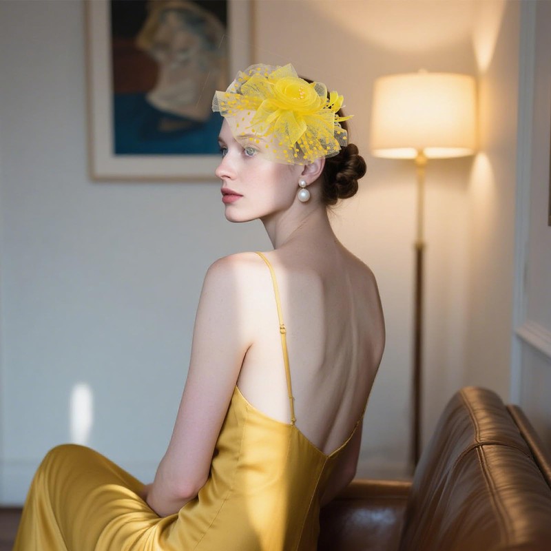 choyaxo Fascinators Hat Cocktail Hat Feathers Veil Headband with Hair Clip for Tea Party Girls and Women Yellow