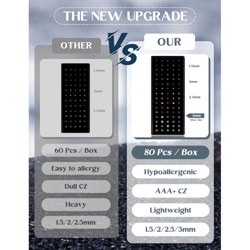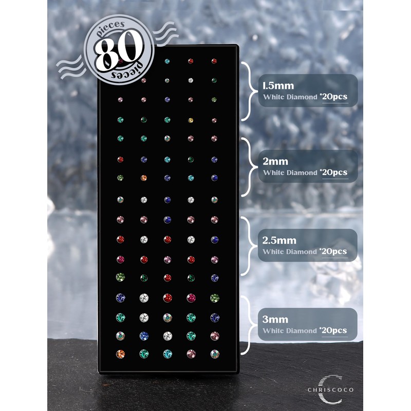 - Boxed Nose Studs: A box of 80 nose studs, available in various sizes and colors for you to choose from.About size: Each box contains 20 pieces of 1.5mm, 20 pieces of 2mm, 20 pieces of 2.5mm, and 20 pieces of 3mm CZ studs.About Color:we have full of white CZ, all of colored CZ, or containing 40 colored CZ and 40 white CZ boxed nose studs
