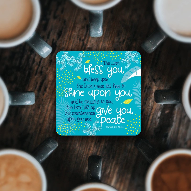 Christian Coasters, Pack of 6 cork coasters, The Lord Bless you (teal), with Bible verse Numbers 6:24-26. Beautiful Christian gifts for women or men, by Just Cards Direct