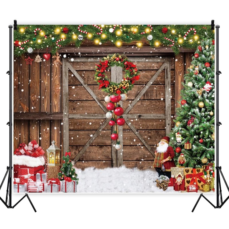 Christmas Backdrops for Photoshoot 10x8ft Vinyl Barn Wood Door Xmas Tree Gift Box Christmas Photography Backdrop Snowy Snowflake Xmas Wreath Xmas New Year Party Decorations Background Photo Booth