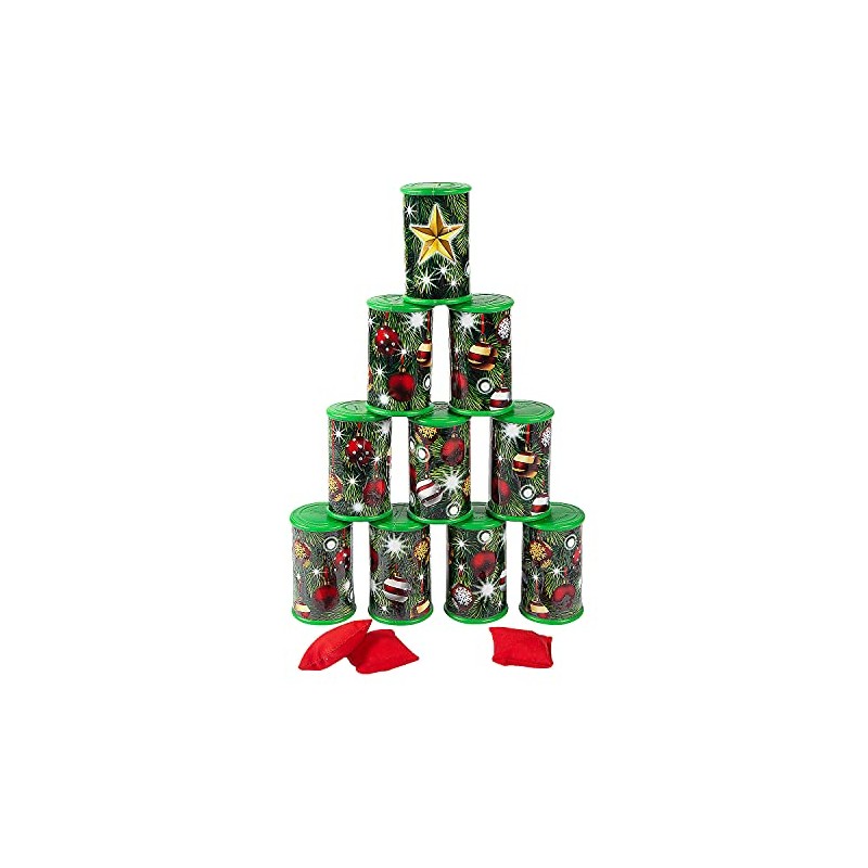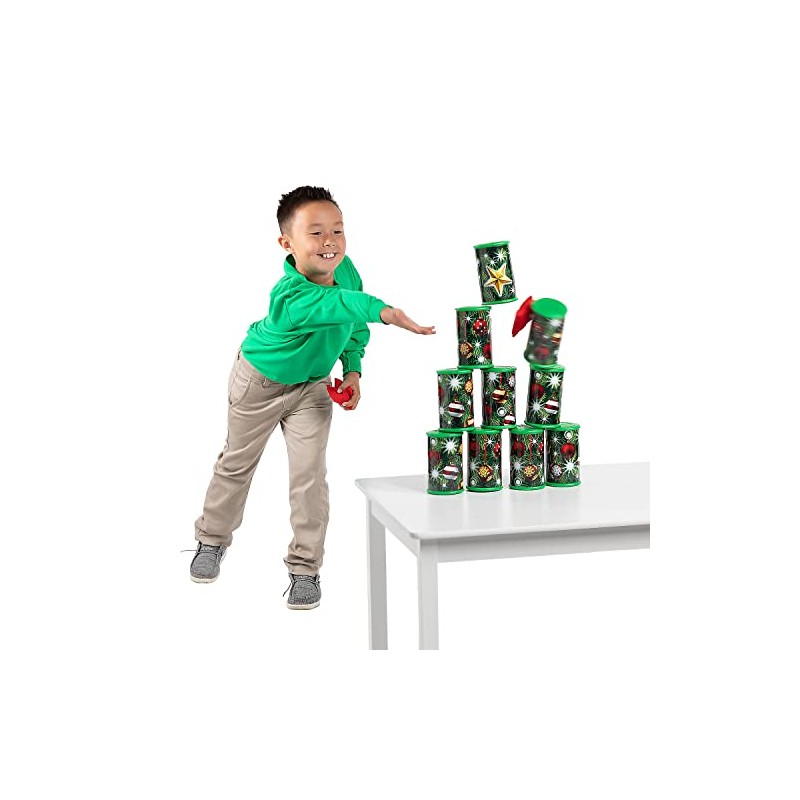 - This carnival game favorite has a holiday spin! Players toss beanbags to try to knock over the Christmas-themed cans. A great activity for a kids’ holiday party or in the classroom during the Christmas season, this game is simple to play and fun for most ages! Play with one person versus another or teams against teams. Plastic. (13 pcs. per set) Ten 5" cans and three 2 1/4" polyester bean bags.