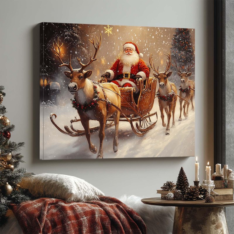 - Classic Christmas Scene: This wall art captures a festive winter scene with Santa Claus sitting on his sleigh, reindeer, snowy roads and falling snowflakes, bringing the magic of Christmas into your home.