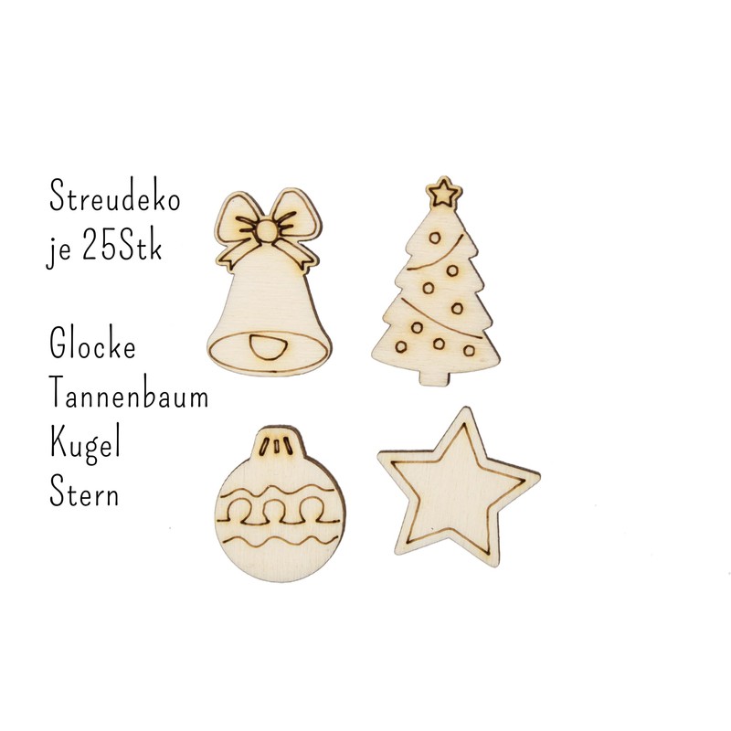 Our unique wooden confetti in the shape of Christmas trees, Christmas tree baubles, bell and stars are the perfect table decoration for Christmas. This scatter decoration is not only beautiful to look at, but also robust and durable. You can use them again and again and thus use them every year. The natural material gives your decoration a rustic charm that is guaranteed to attract everyone's attention. The uses are endless! Sprinkle the wooden elements on the tables to add a festive accent, or integrate them into your table decorations and Christmas gifts. You can even use them as special gift tags or include them in party favours to give your guests a little joy. Our product is also ideal for crafting clothes pegs with letters.