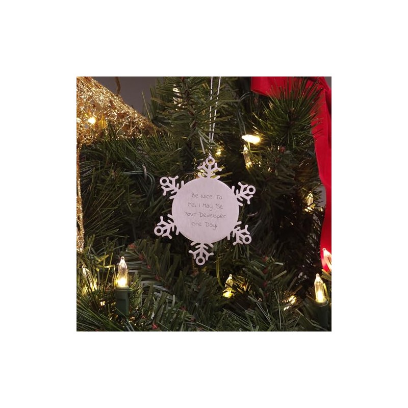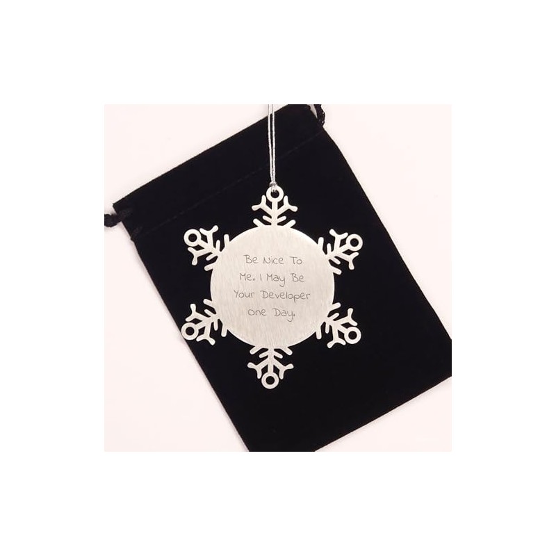 - Make a statement this Christmas with our Be Nice To Me. I May Be Your Developer One Day. Snowflake Ornament, crafted from premium stainless steel for durability and safety.