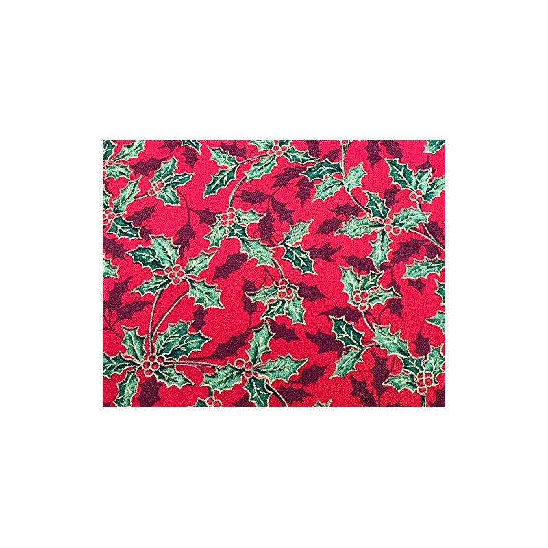Christmas Fabric - Holly & Berry Metallic Gold Leaf Print on Red - Cotton Craft Fabric Material Metre (349EIC)