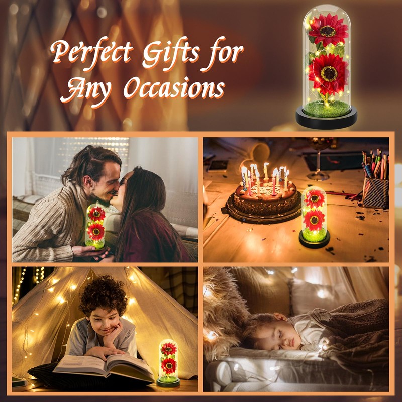 - 💝 Elegant Home Decor Light: The glass sunflower with warm white lights is not only beautiful mothers day decoration, birthday decorations, Christmas decor, wedding decorations, but also a warm night light for kids. In the daytime, the sunflowers in bright glass dome are gorgeous, making the living room, bedroom, office, wedding, birthday party or holiday scenes filled with magic and life. At night, the shining flower is surrounded warm white lights, accompany her to sleep peacefully.