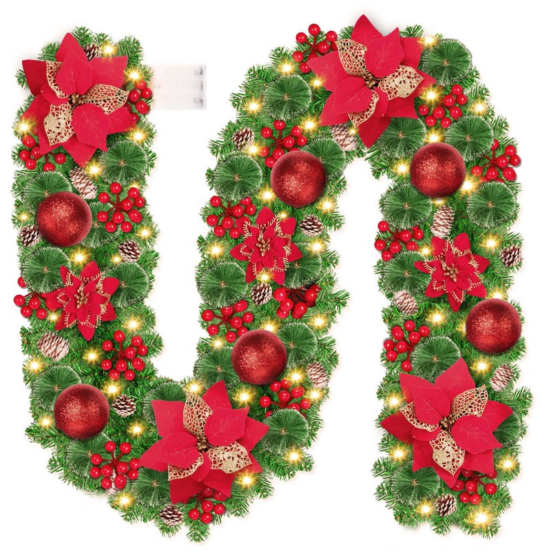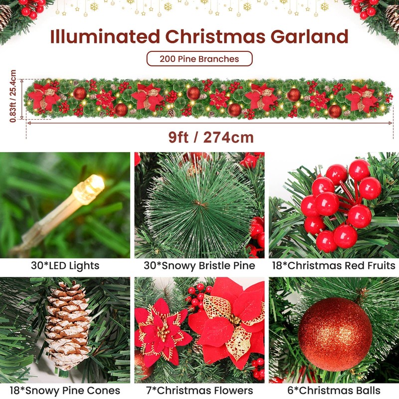- 🎄The box contains 1 x pine garland with 30 LED lights powered by batteries, along with 6 x red balls, 18 x red berries, 30 x pine needles, 18 x pine cones, and 7 x red flowers.