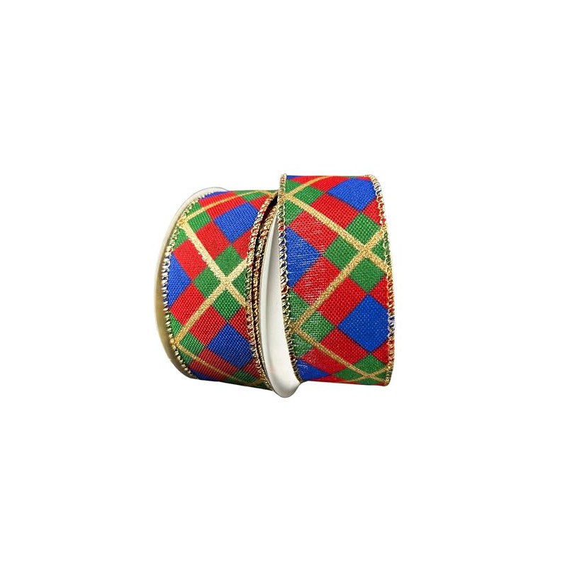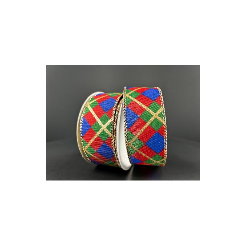 - DIMENSIONS: 1.5 inch wide ribbon with wired edges spans 10 yards in length, featuring a festive plaid pattern in red, blue, green, and metallic gold accents