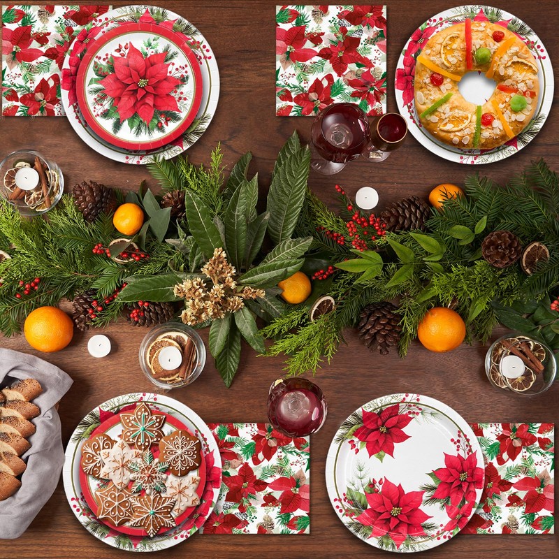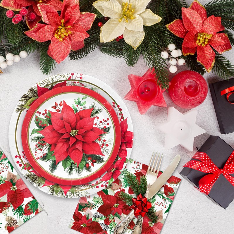 Christmas Poinsettia Tableware Set, 9.2" Paper Dinner Plates, 7" Paper Dessert Plates, 6.5" Luncheon Napkins, Christmas Poinsettia Pine Cones and Red Berries Xmas Party Decoration Set, Serves 50