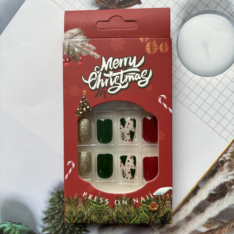 Christmas Press on Nails Green Fake Nails Short Square False Nails with Christmas Tree Designs Gold Glitter Glue on Nails Red Stick on Nails Full Cover Cute Acrylic Nails Glossy Artificial Nails