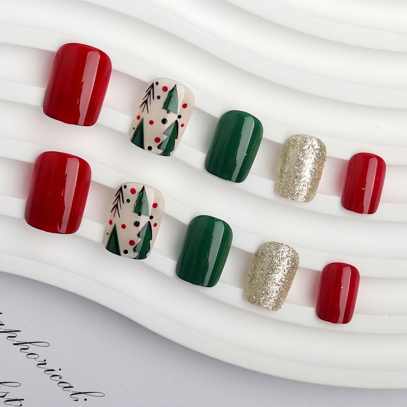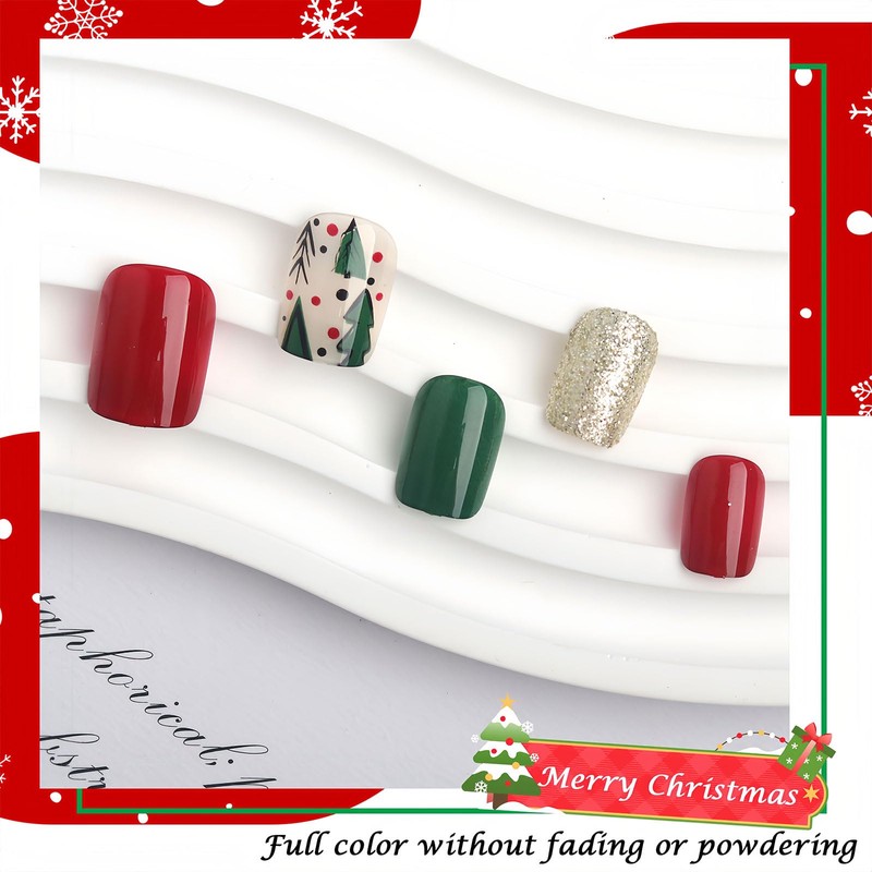 - Classic Christmas Colors: The Christmas press on nails feature classic Christmas colors—red, green, and gold as the base colors, complemented by elegant Christmas tree designs, bringing a festive and joyful spirit to your nails