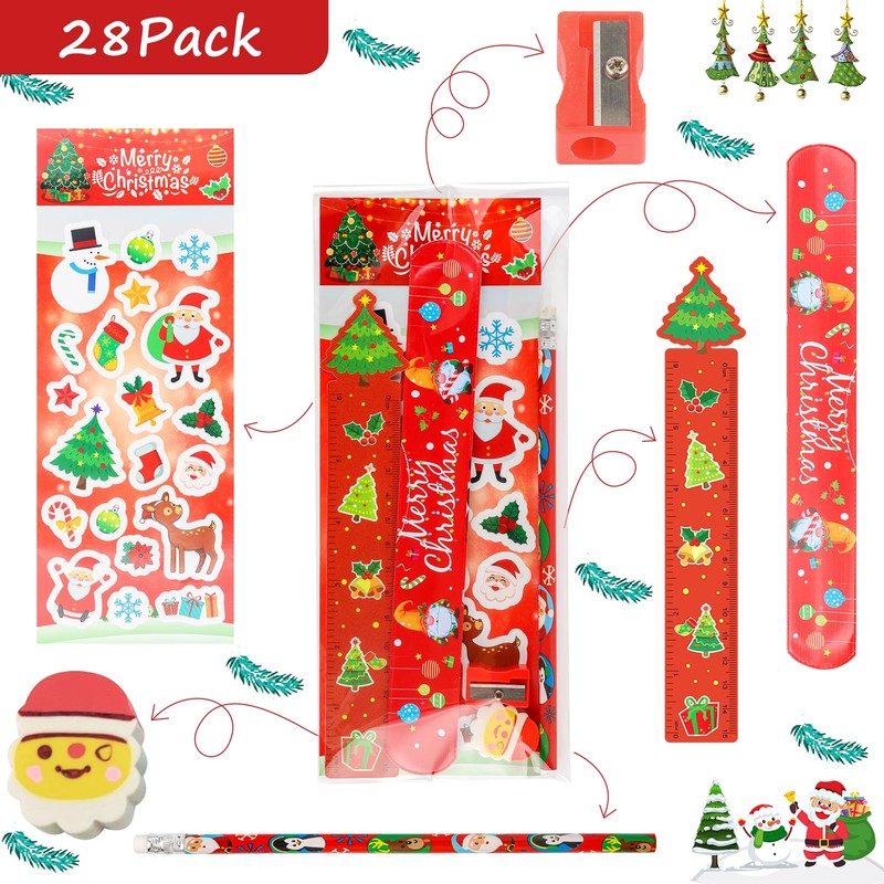 Christmas School Stationery Party Favors 28 Pack with Pencils, Rulers, Erasers, Stickers, Goodie Bags for Kids, Classroom Gifts, Bulk Prizes, Holiday Gifts