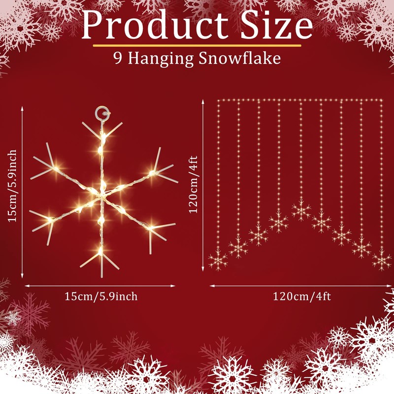 - 9 Snowflake Ornaments: these curtain lights outdoor contain 9 pieces of wrought iron snowflake accessories, with strings of lights wrapped around these lovely snowflakes, you'll find these bright curtain lights look extra beautiful at night; The middle snowflakes hang at the highest point, and the outside snowflakes hang at the lowest point, if you hang them at the door, you can easily pass under them, eye catching and charming