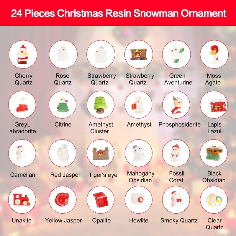 - Advent calendar 2024: set of 24 fantastic Christmas snowmen made of resin decorations. Calendar copies daily from one. 24 Christmas snowman baby, Santa Claus, house building, ornament set made of resin and advent calendar for the celebration of the year 2025! Is a good collection.