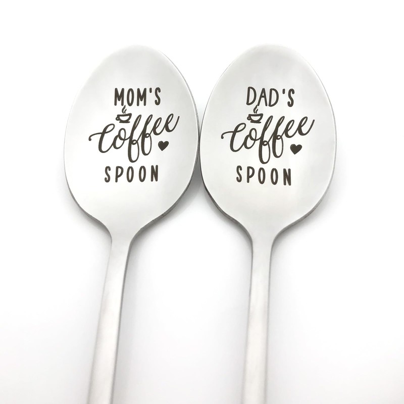 - MOM AND DAD GIFTS: Engraved as "Dad's Coffee Spoon" “Mom's Coffee Spoon”. Look no further on your hunt for gifts for mom and dad. This spoon is great gift for parents from daughter, son, kids, children, new parent gifts, first time parents, promoted parents.