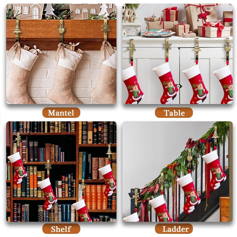 - The mantle stocking holders set of 4 meet the needs of the family. The stocking hangers for mantle stocking holders is matched with typical Christmas elements, deer, tree, snowman, and snowflakes, this metal stocking holders for mantle fits the festive mood of Christmas.