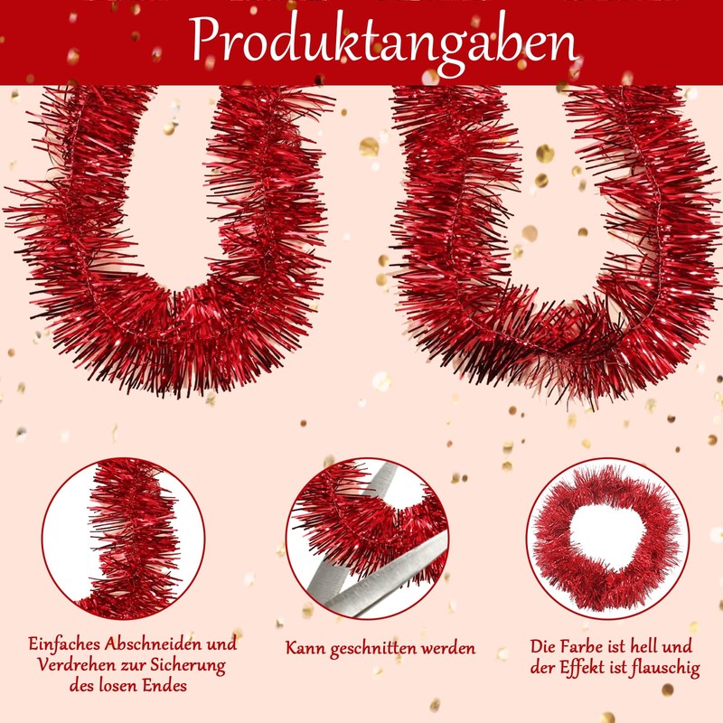 - Design: the sparkling Christmas rose red garland is very beautiful and the Christmas tree garland rose red is very easy to decorate. Put it on the Christmas tree, tinsel garland rose red can add sparkle to your Christmas tree.