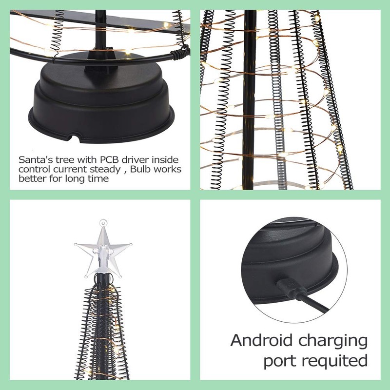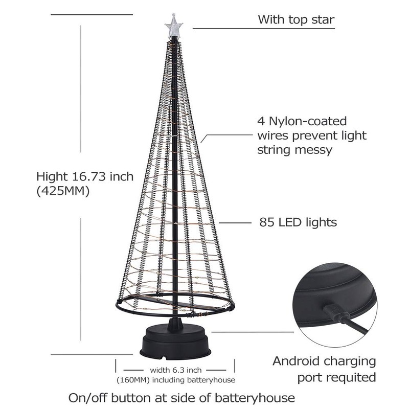 - Unique Design:Tree structures metal frame and flat plate foot with batteryhouse outside,Tree with top star comes into 40 warm white Leds ,light string wrapps around it ,Battery operates Lights ,Especially Tree could be charged via android port as well L
