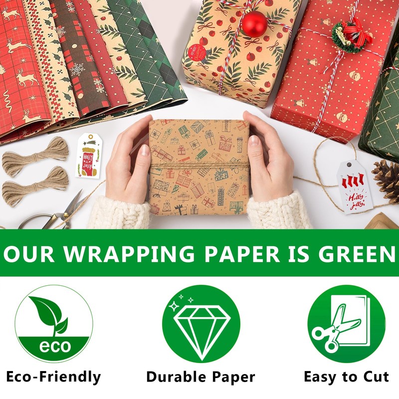 - ECO-FRIENDLY & SUSTAINABILITY The Christmas wrapping paper set is made of environmentally friendly materials that are easy to recycle, making it a sustainable choice for environmentally conscious consumers. The use of recycled paper in our gift packaging highlights our commitment to sustainability. Our customers can pack their gifts beautifully and environmentally consciously, which makes this Christmas wrapping paper set solution ideal for both the environment and your holiday needs.