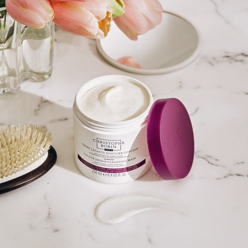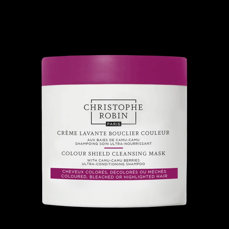 Christophe Robin Colour Shield Cleansing Mask With Camu-Camu Berries 250ml is a low-foaming cleansing mask that helps prolong the vibrancy of color-treated hair while nourishing and protecting hair's natural oils for a glossy, long-lasting radiance.