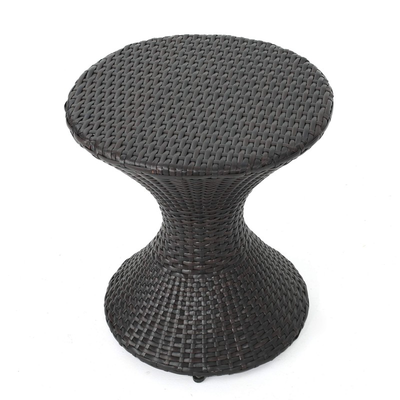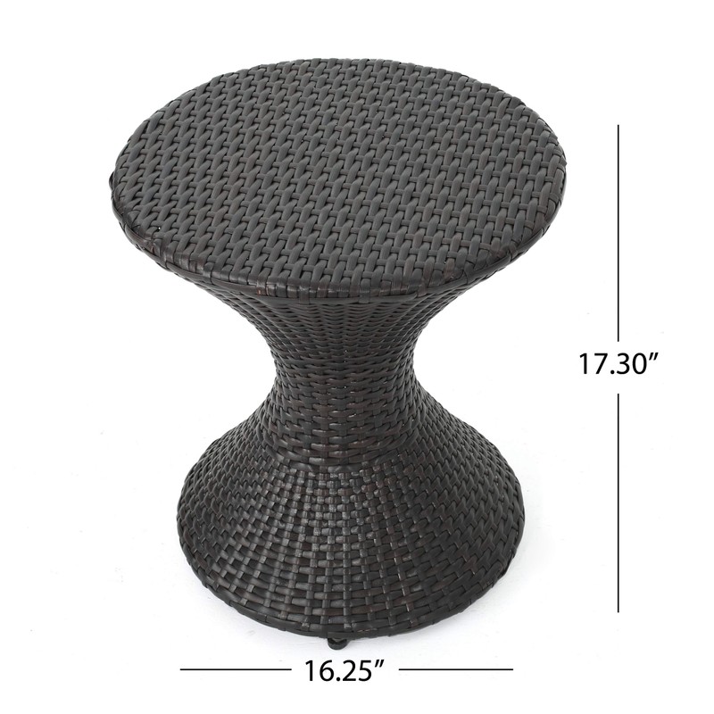 This attractive, hourglass-shaped side table ensures that you will always have a place to set down everything you need for an afternoon spent enjoying the outdoors. Made from the highest-quality wicker over a durable iron frame, It balances durability with aesthetics. A perfect addition to your garden, patio, or backyard. Product details Includes: one (1) side table material: Polyethylene wicker frame material: iron wicker finish: multi-brown no assembly required Dimensions: 16.00"D x 16.00"W x 18.00"H.