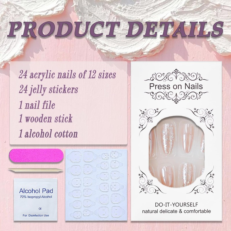 Package Contents: 24pcs false nails,24pcs Jelly glue, 1pc wood stick, 1pc mini nail file, 1pc alcohol pads.