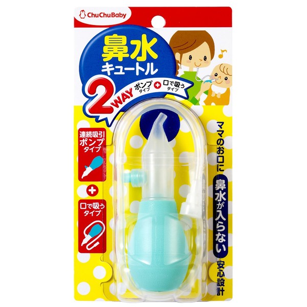 ChuChuBaby 2 - way type Nasal suction device with 2 - Way suction lets you remove mucus by pump or by mouth.Easy to use with nozzles that safely fit the nose opening so you can get the right angle without danger of injury.2 - Way type so that you can adjust the method according to the needs of your baby.Reduced risk of infection from mom and dad.The segment for baby's nose is a soft nozzle.Even using continuous suction, backflow valve prevents mucus and air from flowing back to baby's nose.Can be completely disassembled for washing and all joints can be sterililized. The case is for washing only; Usage: Suction with pump: