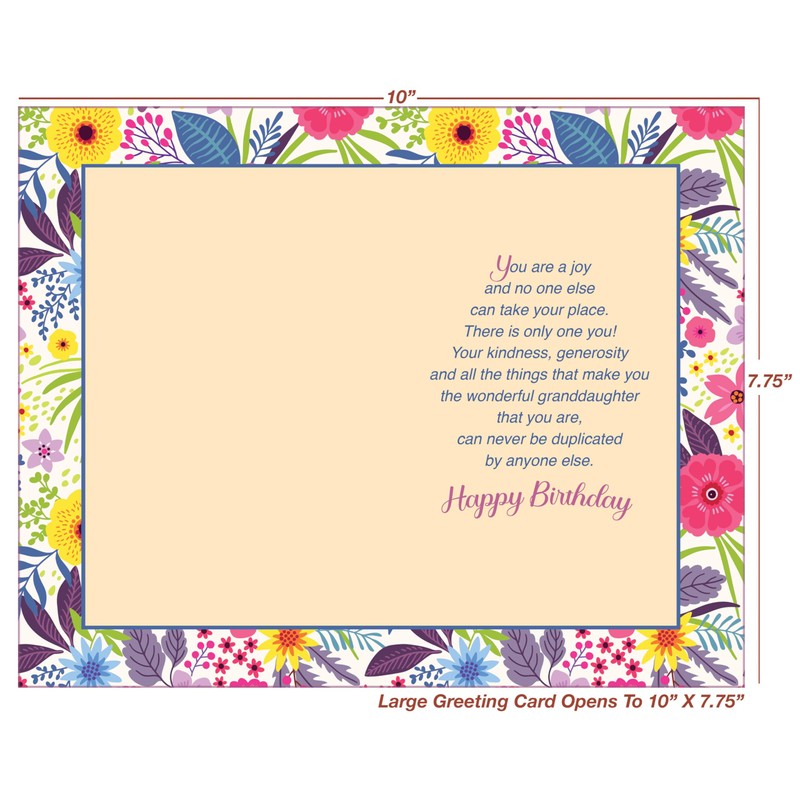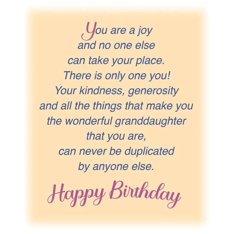 - INSIDE MESSAGE - You are a joy and no one else can take your place. There is only one you! Your kindness, generosity and all the things that make you the wonderful granddaughter that you are, can never be duplicated by anyone else. Happy Birthday